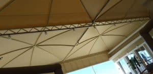 - يعمل الفني على تركيب دعائم في المظلة من الأعلى وتثبيتها بواسطة أستخدام لحام من نوع جيد، وذلك لكي لا تتعرض أقمشة المظلة للتمزق بسبب عدم وجود داعم لها.